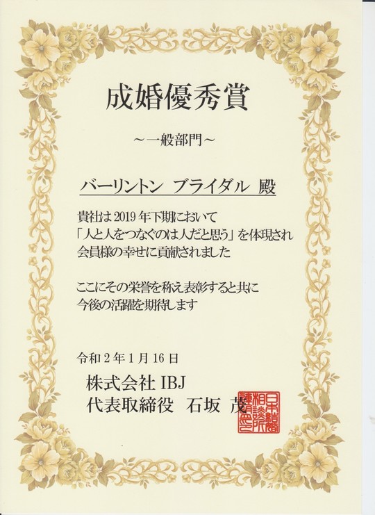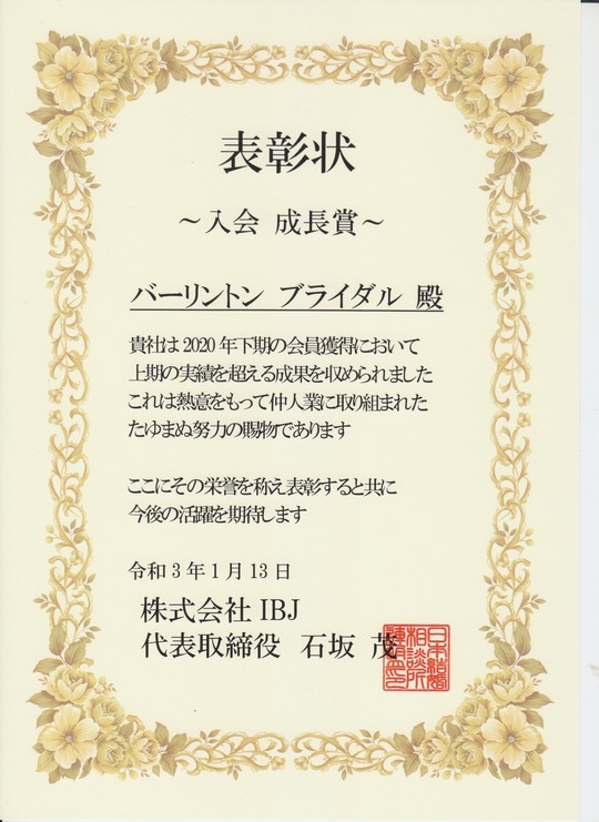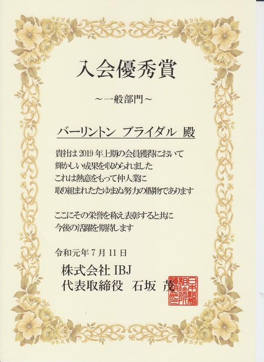 | 2019年上期 | IBJより「入会優秀賞」を受賞 |