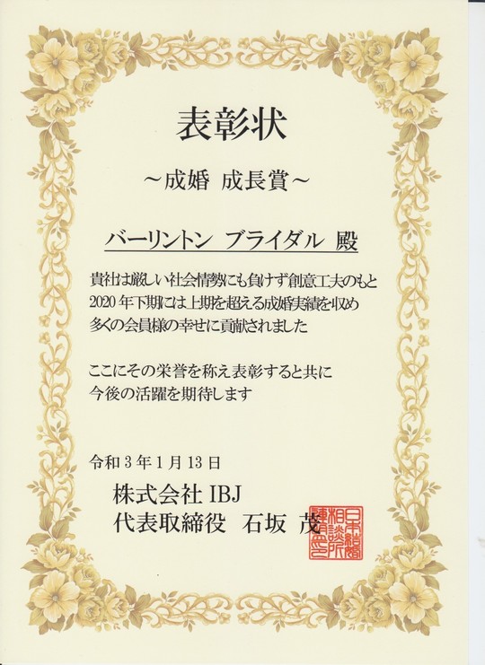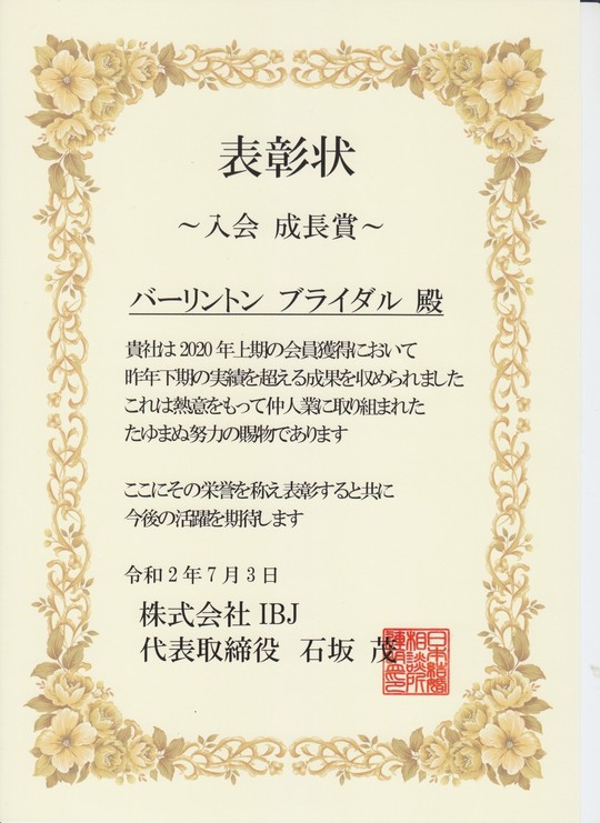 | 2020年上期 | IBJより「入会成長賞」を受賞 |