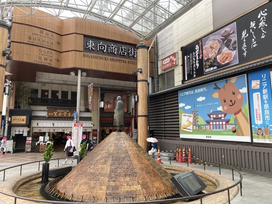 ④駅前の行基菩薩像の噴水がある先の「東向商店街」を南(右方向)へ約200m