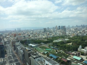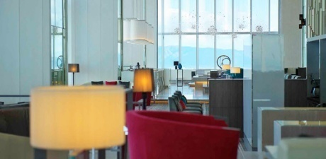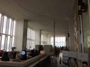 あべのハルカス19階の大阪マリオット都ホテル フロントロビーに位置するラウンジは、高さが約100mの場所に位置し、開放的な窓からの景色を眺めながらのティータイムは格別です。